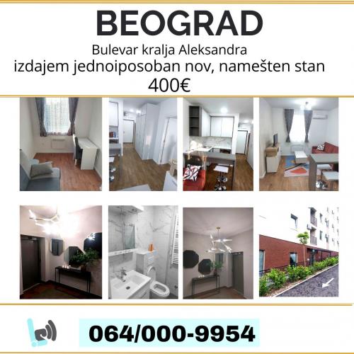 Beograd, izdajem nov lux jednoiposoban stan 36m2, Bulevar Kralja Aleksandra 515, I sprat, novogradnja, odvojena spavaća soba, namešten, sve nove stvari, ugradna bela tehnika, veš mašina za pranje i sušenje veša. Cena 400 eura, depozit, vlasnik 0640009954
