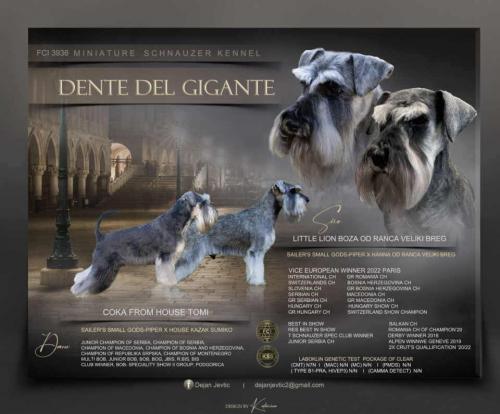 Majka: COKA FROM HOUSE TOMI - Junior Champion of Serbia; Champion of Serbia, Macedonia, BiH, RS, Montenegro, Multi JBOB, BOB, BOG, JBIS, R.BIS, BIS; Club Winner; BOB – Speciality chow II FCI group, Podgorica