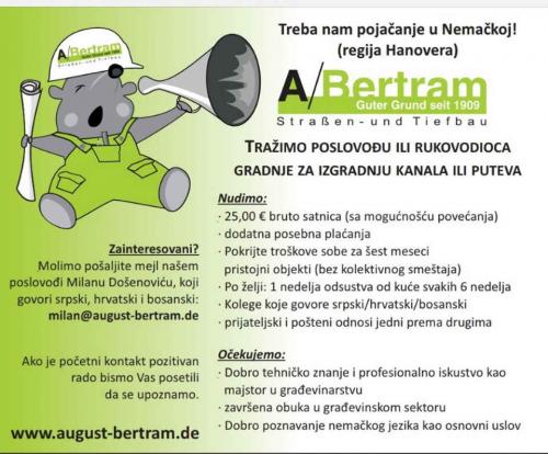 Potrebno profesionalno iskustvo majstora u gradjevinarstvu, dobro poznavanje nemačkog jezika, kao osnovni uslov.