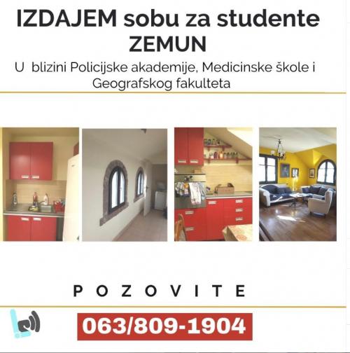 Beograd, Zemun, izdajem studentima dvokrevetnu sobu sa zasebnim ulazom, u blizini Policijske akademije i Medicinske skole i Geografskog fakulteta. Upotreba kuhinje i kupatila. Sve kompletno namešteno i novo. Svi troškovi uračunati u cenu od 150e Kontakt 0638091904 Ljilja