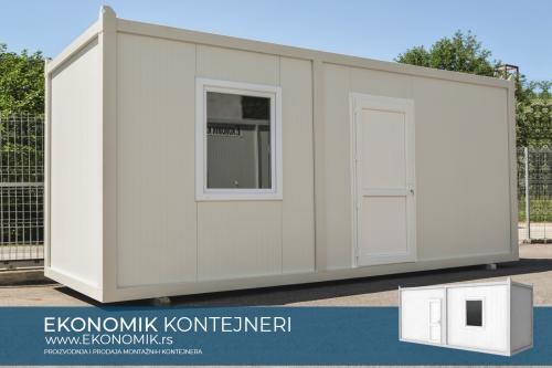 Ekonomik montažni kontejneri su dimenzija 6,00 x 2,40 m2. Kontejner ima pvc stolariju, jedna vrata dimenzije 0,90 x 2,00 m2 i prozor dimenzije 1,00 x 1,20 m2. Na podu je postavljen laminatni parket debljine 7mm. Unutrašnji deo kontejnera ima uradenu elektricnu instalaciju, koja se satoji od led rasvete, dve uticnice, jednog prekidaca i table sa osiguracima. Zidovi su od savremenih sendvic panela, izolacija poliuretan, debljine 40mm, što je adekvatno klasicnom zidu od skoro pola metra debljine. Mnogo manja debljina zida pravi uštedu u prostoru. Transportuju se i prenose veoma lako i jednostavno. Moguce je proizvesti objekat prema željama i potrebama kupaca. Takode za ovakvu vrstu objekta nije potrebna grdevinska dozvola.