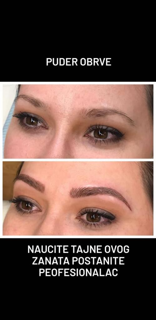 ijih i najtraženijih tehnika trajnog iscrtavanja obrva. Tretman puder obrva se izvodi specijalizovanim mašinicama za trajnu šmniku, kojima se postiže izgled ,,senke” u obrvama, a prema želji klijenta, obrve mogu izgledati potpuno prirodno i neutralno ili naglašeno i glamurozno. Nama je na prvom mestu da od nas izadjete sa znanjem , pratimo Vase radove i imate nasu potpunu podrsku tokom Vaseg rada nakon obuke. Nebitno da li ste početnik ili se već bavite trajnom šminkom, tehnika se brzo uči i jednostavna je za izvođenje. Basic obuka (obuka za osobe koje nemaju prethodna znanja iz oblasti trajne šminke) za puder tehniku senčenja obrva (mikropigmentaciju) podrazumeva teoretski deo ( istorijat trajne šminke, anatomija lica, zlatni presek, tipovi kože, iscrtavanje obrva prema obliku lica, upoznavanje sa različitim tipovima mašinica koje se najčešće koriste za trajnu šminku, upoznavanje sa pigmentima, higijiena za vreme tretmana, upoznavanje sa anesteticima, pravilan odabir pigmenta, pravilna nega nakon tretmana), vežbu na lateksu, kao i praktični rad na devojkama modelima uz asistenciju mentora. Materijal za rad i oprema su obezbeđeni i uključeni u cenu. Obuke su individualne i prenos znanja je stopostotan. Nakon obuke, svi polaznici imaju neograničenu podršku u radu. Obuka u trajanju od 2 dana - 600 EUR Po zavrsenoj obuci dobijate Sertifikat. Molimo Vas pre dolaska pozovite na +38160/6367-624 Viber 062/115-06-57 Novi Sad Milovana Glisica 5