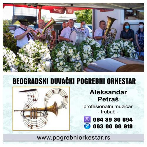 e, pomenima, ispraćajima… Nastupamo kao orkestar, ali i pojedinačno – truba, violina, crkveni hor – sve u zavisnosti od želje klijenata. U repertoaru koji sviramo nalaze se pogrebni marševi, starogradske pesme, romanse, romske pesme, sevdalinke, klasična muzika… Trudimo se svima da izađemo u susret onoliko koliko je u našoj moći,naravno da to bude sa ukusom uzimajući u obzir o kakvom događaju je reč.
